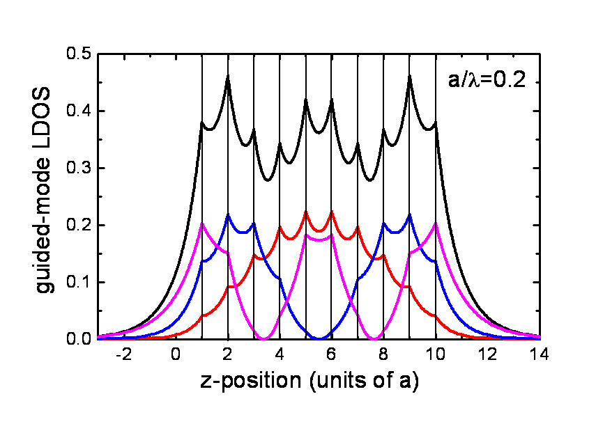 Abstract: Spontaneous emission rates in a dielectric structure are position dependent and proportional to the local optical density of states. The latter can be calculated when the Green function is known. In our scalar formalism, we model dielectric slabs as infinitely thin planes and use the T-matrix formalism of multiple-scattering theory to find an exact analytical expression for the Green function of a dielectric mirror of arbitrary number of unit cells N. All the propagating and guided modes of the structure are found. There are at most N guided modes and their dispersion relations are studied. The guided modes appear around frequencies corresponding to the first stop band in normal direction. Local densities of propagating and guided modes are presented, also for frequencies where the layered structure acts as an omnidirectional mirror.